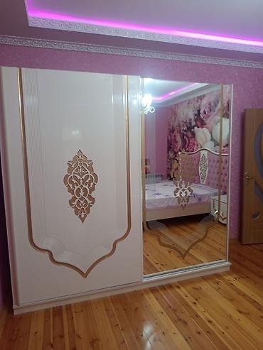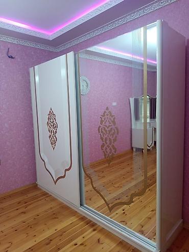 - Sürgülü qapılı dolab: bir qapısı tam güzgülü, digər qapıda qızılı naxışlı dekor. Sükutla çalışan rels sistemi, geniş daxili saxlama yeri.