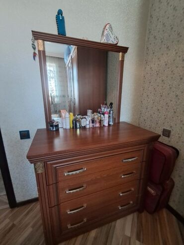 - Komod-güzgü: üstündə iri güzgü çərçivəsi, 4 geniş siyirmə, dekorativ tutacaqlar; üst panel kosmetika və aksesuarlar üçün rahatdır