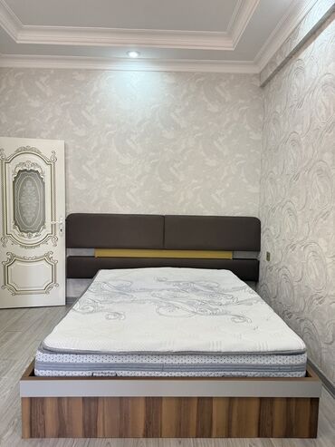 - Yataq: taxta karkaslı, aşağı baza ilə; qəhvəyi/boz tonlarda çarpayı korpusu. Yumşaq başlıq paneli divara montajlı, 3 bölməli dəri görünüşlü yastı hissələr və arada sarı dekor zolağı.