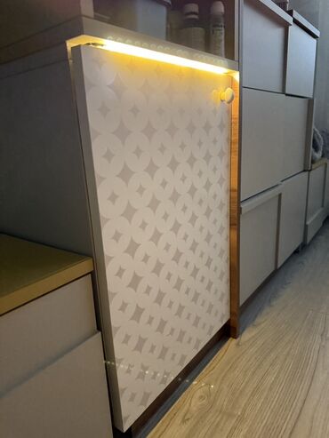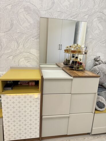 - Güzgülü komod/biüro: iri kvadrat güzgü, çoxbölməli çekmecələr, üst səth ağ və ağac teksturasının kombinasiyası; sol hissədə içi rəfli, sarı qapaqlı bölmə, ön paneldə işıqlandırma zolağı.