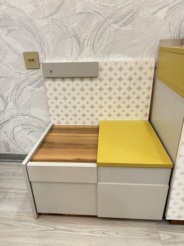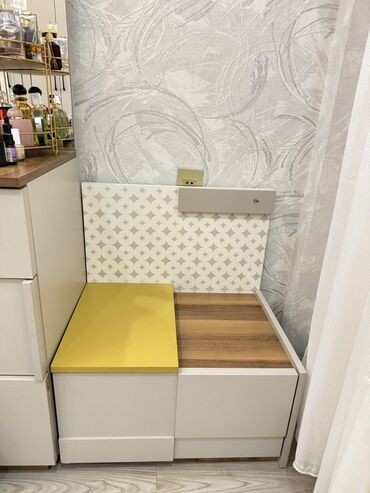 - 2 ədəd tumba: boz korpus, üst səthlərdən biri ağac teksturası, digəri parlaq sarı dekor; hər birində sürüşən çekmecələr. Arxa paneldə ağ naxışlı dekor və üstündə açarlı kiçik rəf mövcuddur.