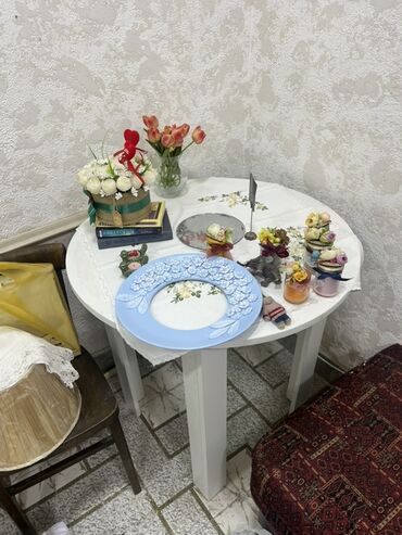 Birinci fotodakı masa 60 azn, diametr 1 metr, ikinci fotodakı masa 40 azn, dianetr 800 sm, stulların hər biri 10 azn. Materialları çox möhkemdir. Ünvan Xocesen