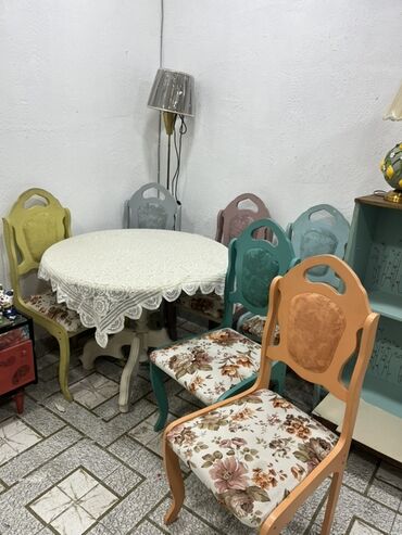 - 6 ədəd stul: fərqli pastel tonlarda (narıncı, yaşıl, mavi, tünd zümrüd, boz, toz pembe). Oturacaq hissələri çiçək naxışlı parça ilə, kürək hissəsi dekorativ panellə işlənmişdir.