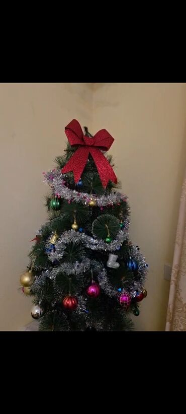- Süni şam ağacı: sıx iynəli, konus formalı, ucluqları gümüşü qarlama effektli. Üst hissədə iri qırmızı parıltılı kəmər-qaşlı bant. Ağac üzərində gümüşü yağış-mişura zənciri, müxtəlif rəngli (qızılı, gümüşü, qırmızı, mavi, yaşıl və s.) şar və fiqurlu oyuncaqlar, zəng və corab asılqanları.