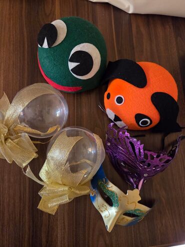 - Dekor topları və aksesuarlar: iri şəffaf plastik şarlar qızılı lentlə, yumşaq materialdan hazırlanmış iki ədəd dekorativ top (yaşıl “şən sifət” və narıncı “it” temalı), iki ədəd maska (bənövşəyi və mavi-qızılı parlaq naxışlı).