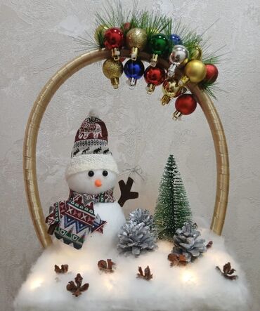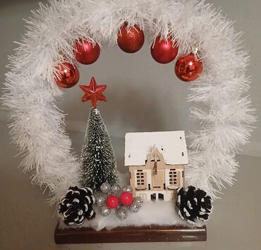 - Dairəvi quruluşlu masaüstü dekor: üst hissəsi zərif ağ “qar” effektli tinsel ilə bəzədilmiş, müxtəlif rəngli şarlar və iynəyarpaq budaqları/oyuncaqları ilə tamamlanıb.