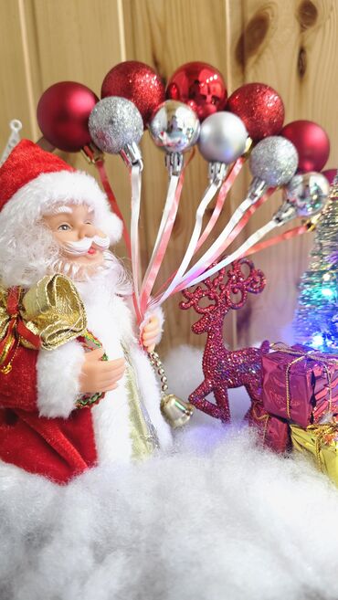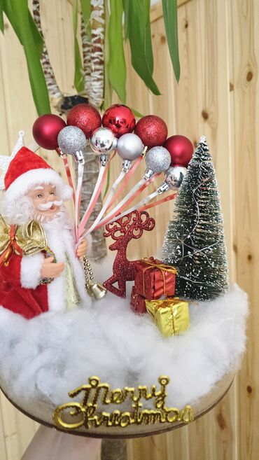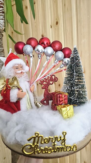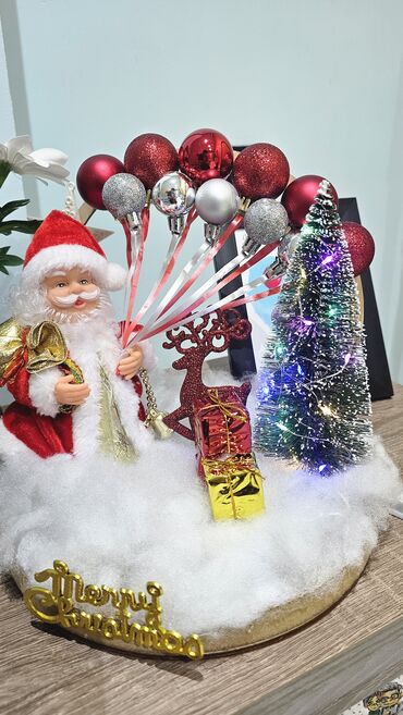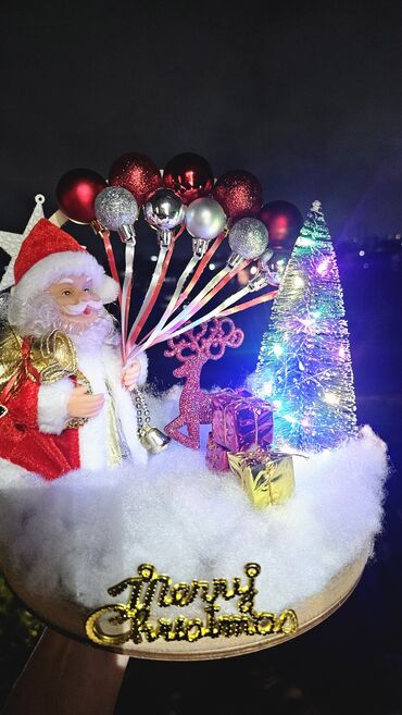 - Kompozisiya: Şaxta baba fiquru, miniatür işıqlı yolka (rəngli LED-lər), parıltılı maral fiquru, hədiyyə qutuları, “Merry Christmas” yazısı.