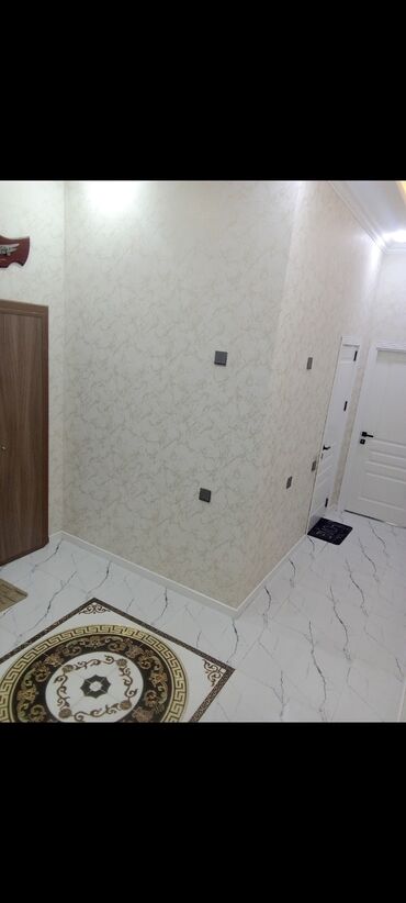 - Geniş dəhliz: mərmər naxışlı parlaq kafel döşəmə, ornamentli medalyon, divarlarda zərif teksturalı oboy, ağ qapılar və qara elektrik aksesuarları.