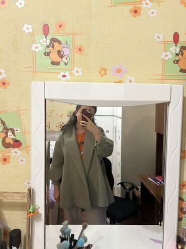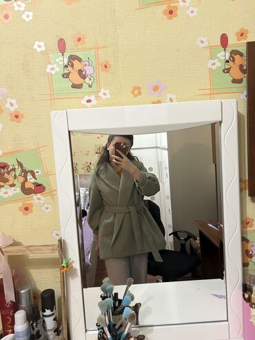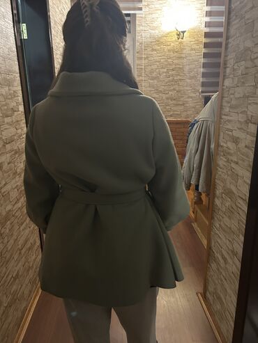 Zeytun-yaşıl rəngdə qadın palto/yaqaüstü. Geniş düşən A-kəsim siluet, böyük şal yaxa və beldən bağlanan kəmər ilə formalaşdırıla bilir. Dizə yaxın uzunluq, uzun qol. Yumşaq, qalın toxumalı parça; gündəlik və ofis kombinlərinə uyğun, həm açıq, həm də kəmərlə bərkidilmiş şəkildə geyinilə bilər. Minimalist dizayn, xətli tikişlər, arxada yüngül plisə effekti ilə həcmi artıran ətək hissə. Neptun-yaşıl ton müxtəlif rənglərlə asan kombinlənir. Şal yaxa sayəsində qat-qat geyimlə rahat uyğunlaşır. şəhər gəzintisi, iş və axşam çıxışları üçün uyğundur.