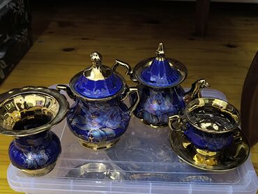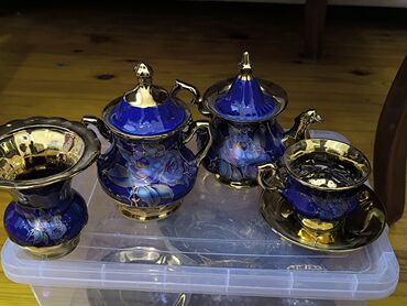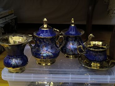 Klassik üslubda porselen çay dəsti – kobalt mavi və ağ fon üzərində qızılı naxışlar və rəngli pastoral səhnələr. Tərkibi: - Çaynik (qızılı tutacaq və ağızlıq) - Süd qabı - Şəkər qabı qapaqlı - 6 ə...