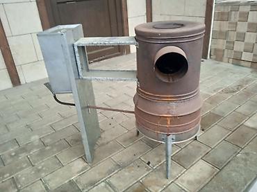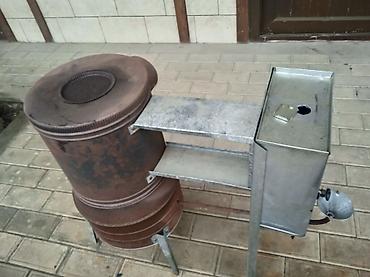 Metall soba/odun peçi - Material: qalın metal korpus, üstü düz polad səth - Ön hissədə tüstü borusu üçün çıxış (diametr təxminən 8–10 sm); bacaya qoşmaq mümkündür - Alt hissədə hava girişi üçün kə...