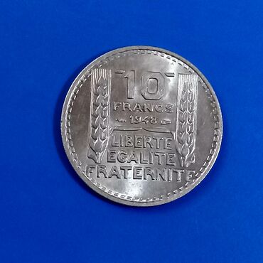 - Arxa tərəf: iki buğda sünbülü arasında “10 FRANCS 1948” yazısı; şüar: “LIBERTÉ ÉGALITÉ FRATERNITÉ”