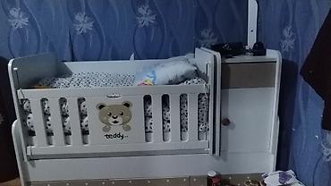 - Uşaq beşiyi – ağ rəngdə, ön tərəfdə “teddy” fiqurlu, yan tərəfində komod/çekmece və qapalı dolab bölməsi.