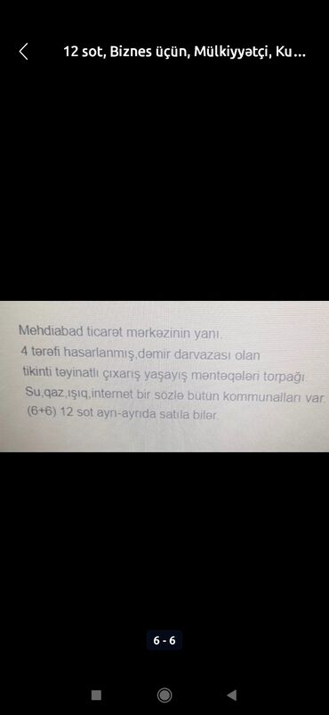 Mehdiabadda Nicat marketin yanında tam mərkezde torpaq sahəsiu satılır.15.500 manat.Melumatı şekili çevirin qeyd olunub.