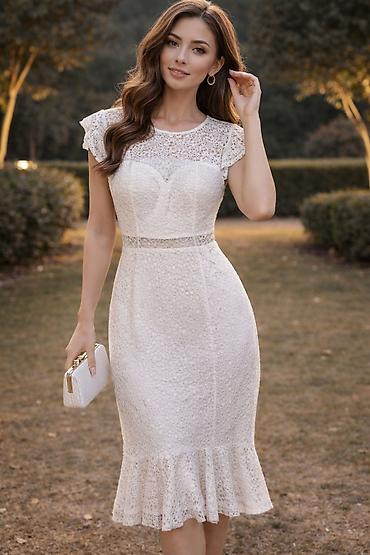 Ağ rəngli zərif krujeva don - Dizayn: Yarımqol, dairəvi yaxa, bel xətti vurğulanmış. - Material: Tam krujeva parça, altlıqla birlikdə; naxışlı tekstura incə və nəfəsalan. - Kəsim: Dizüstü uzunluq,...