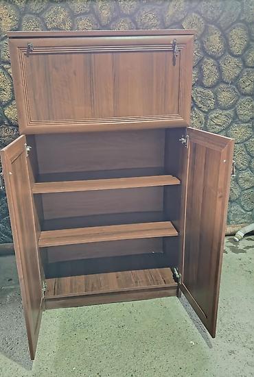 Mebel növü: Ayaqqabı dolabı - Material: taxta-kompozit (qoz rəngli dekor), metal tutacaqlar və möhkəm mexanizmlər - Konstruksiya: 3 qatlanıb-açılan bölmə (tiptronic/flap sistemi) + yuxarıda ayrıca...