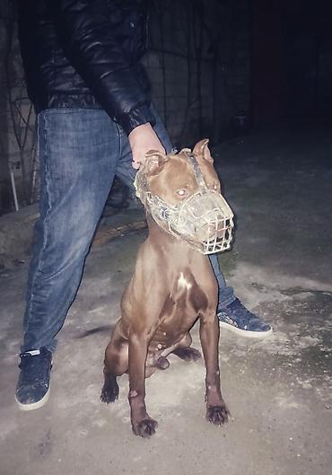 Amerikan Pit Bull Terrier, qəhvəyi rəng (sinədə ağ ləkə). Erkək, güclü sümük quruluşu və əzələli bədən. Qısa, parlaq tük örtüyü; qulaqlar kəsik formanı xatırladır. Boyunluqda möhkəm, eni geniş baş quruluşu, qısa ağız, dərin döş qəfəsi. Aktiv, yüksək enerjili və ayıq-xəbərdarlıq instinktinə malikdir. Təlim və məşqlərə motivasiyalı, itaət və mühafizə yönümlü işlər üçün uyğun ola bilər. Fotoşəkillərdə ağızlıq və zəncir ilə göstərilib.