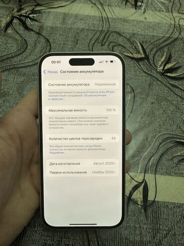 - Batareya məlumatı (Settings → Battery Health səhifəsindən): Maksimal tutum 100%, şarj dövrləri 44, vəziyyət “Normal”