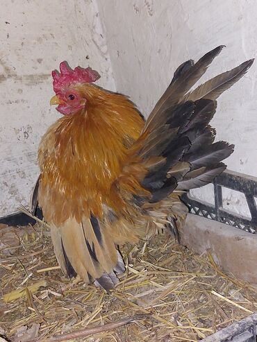 Məhsul: Xoruz Təsvir: - Rəng: qarışıq qızılı-qəhvəyi kürək, açıq krem boyun, ağ quyruq lələkləri - Bədən quruluşu: uzunboyun, güclü sinə, möhkəm ayaqlar - Lələk quruluşu: quyruqda uzun və sıx ağ l...