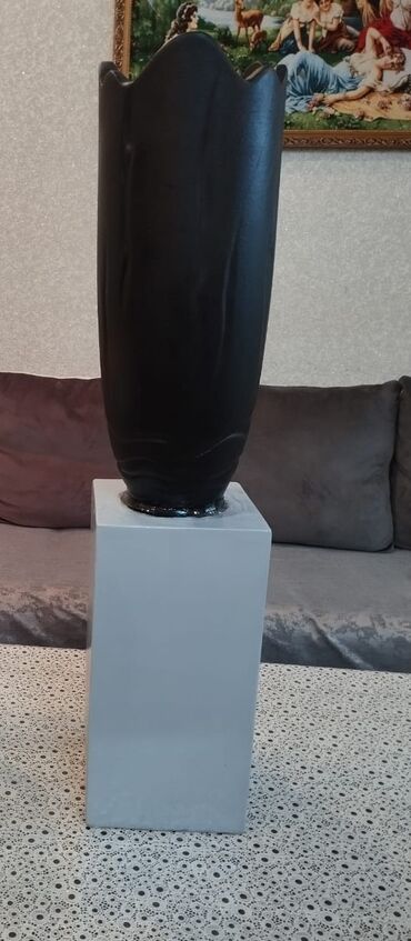 Böyük dekorativ vaza – tekstural beton görünüşlü - Material: beton/daş kompozit (ağ-qara tekstural boya ilə). - Forma: iri, yumurta/konus silueti; yuxarı hissədə dairəvi açılış. - Rəng və faktura:...Giriş•Qeydiyyat