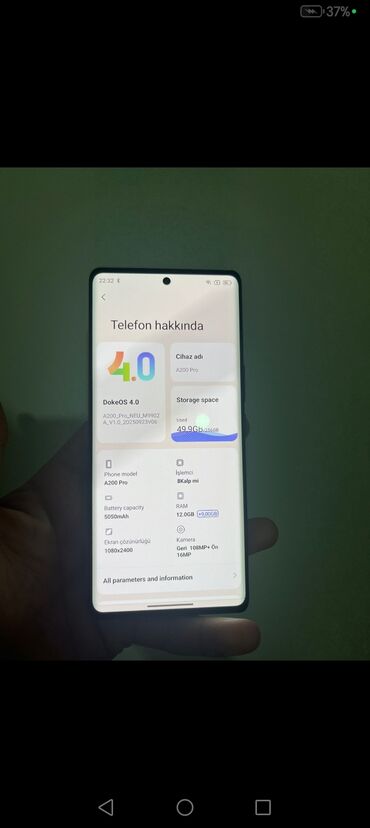 Telefon “Telefon haqqında” bölməsinin şəkillərində bütün parametrlər göstərilib: A200 Pro modeli, 256 GB yaddaşdan təxminən 49.9 GB istifadə olunub. Şık dizaynlı, əyri ekranlı, güclü kamera və böyük batareya ilə gəlir.