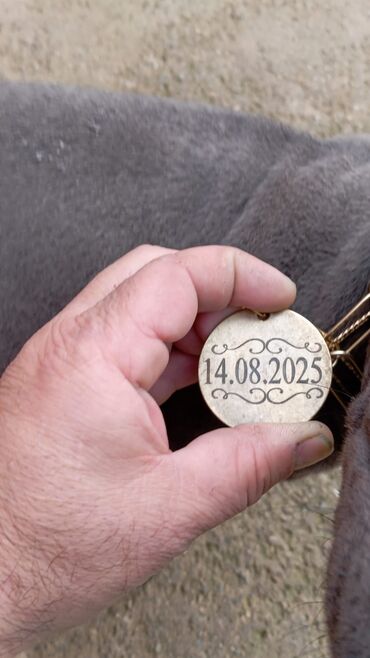 ErkekBoz rəngli, qısa tüklü balaca it – güclü quruluşlu, enli sinəli, qısa quyruqlu. Boynunda metal medalion var; üzərində tarix: 14.08.2025. Qulaqlar kəsik formadadır. Sərt, hamar tük örtüyü, iri pəncələr və ifadəli gözlər.