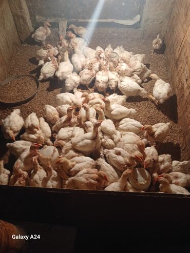 Məhsul: Broyler cücələri (ağ rəngli) Təsvir: - Şəkillərdə təsərrüfat şəraitində saxlanılan çoxsaylı ağ broyler cücələri. - Qapalı, ağardılmış divarlı toyuqxanada saxlanılır; döşəmə samanla örtülüb...