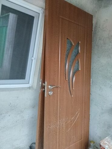 Şüşə panellər və metaldan hazırlanmış barmaqlıqları olan taxta giriş qapısı. Bu qapı iki yan şüşə panel və bir üst şüşə panellərlə təchiz edilmişdir. Qapı tutacağı və kilidi qızılı rəngdədir və qap...
