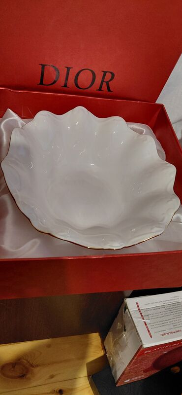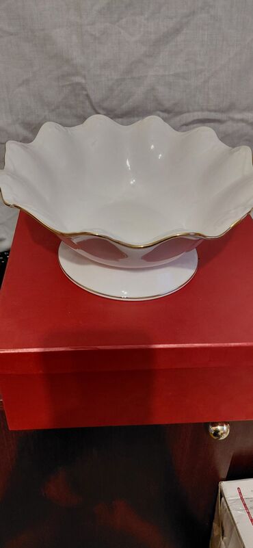 Zərif dizaynlı dekorativ ayaqlı qab - Material: yüksək keyfiyyətli porcelan - Rəng: ağ korpus, kənar və ornamentlərdə parlaq qızılı tonlar - Bəzək: əl işi kimi görünən relyefli çiçək motivləri və i...