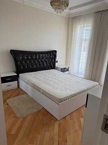 - Yataq: ikinəfərlik, ağ rəngdə korpus, hündür qara süni dəri başlıq (kapitone işləməli). Matrass görünür.