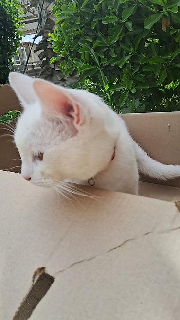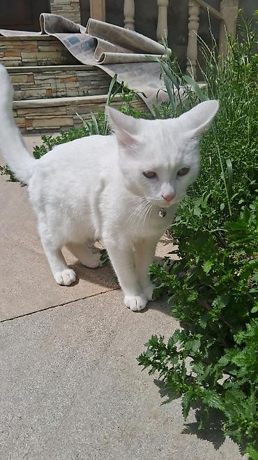 Ağ rəngli ev pişiyi – heteroxromiyalı gözlər - Tam ağ tüklü, qısa tüklü pişik - Gözlər: bir göy, bir qəhvəyi (heteroxromiya) - Burun və qulaq ucları çəhrayı - Boynunda tənzimlənən, metal tokalı rən...