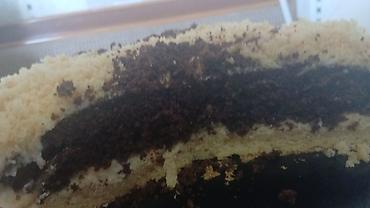- Biskvit tortu: açıq və kakao qatlı yumşaq biskvit, arası yüngül krem, üstü iki rəngli qırıntı ilə dekor. Kəsimdə aydın qatlar görünür.