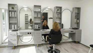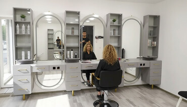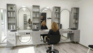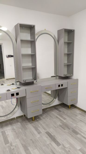 - 3 iş yeri üçün modul quruluş: hər post üçün böyük oval güzgü, iş səthi və saxlama bölmələri
