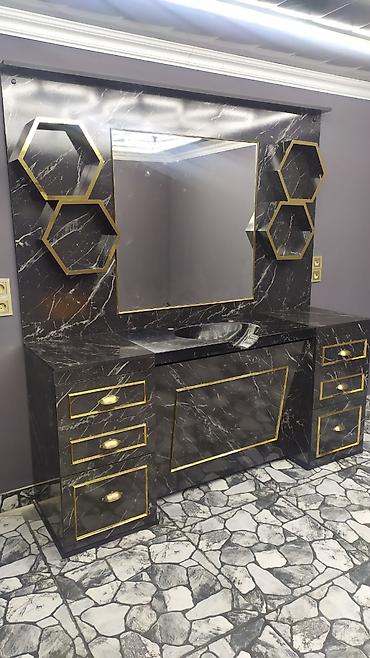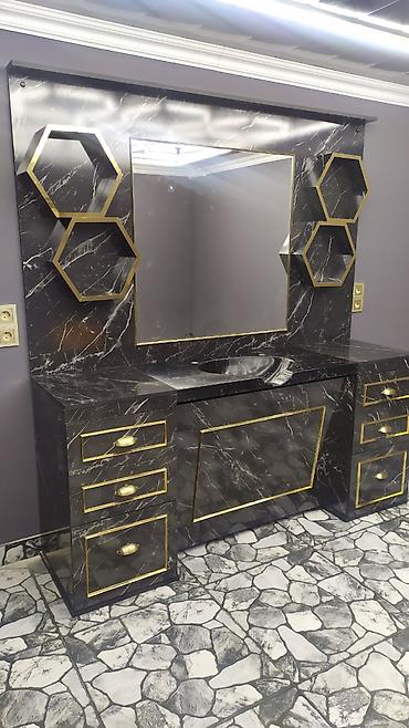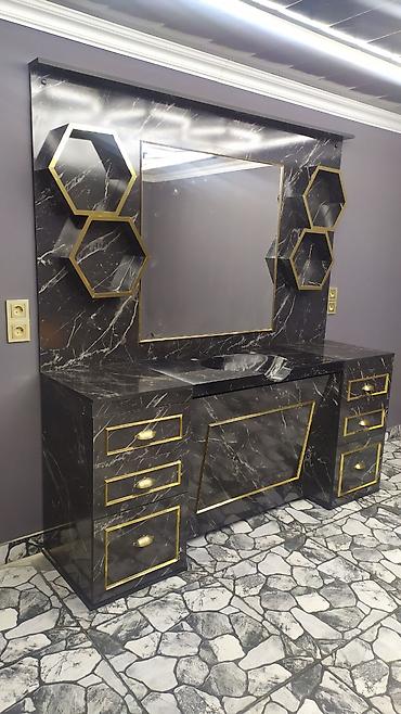 Mebel: Güzgülü makiyaj masası (konsol) Təsvir: - Enli güzgü ilə birləşmiş makiyaj masası/konsol. - Üst hissə qara parlaq səthdir, aksessuar və kosmetikaların yerləşdirilməsi üçün genişdir. - Korpu...