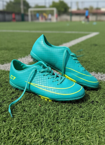 Məhsul: Futbol butsları - Rəng: Firuzə-yaşıl gövdə, neon-sarı xəttlər - Üst material: Şaxmat naxışlı sintetik örtük, asan təmizlənən və topa nəzarəti artıran faktura - Bağlama: Kordonlu - Daxili:...