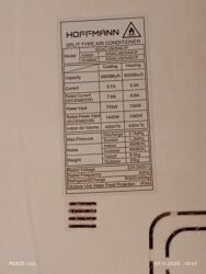 Hoffmann split tipli kondisioner – 120 (12.000 BTU) sinfi. Texniki məlumatlar (etiketdən): - Model: SAAC-36HRA (seriya üzərində göstərilib) - Soyutma gücü: 3600 W (təxmini 12k BTU) - İsitmə gücü: ...