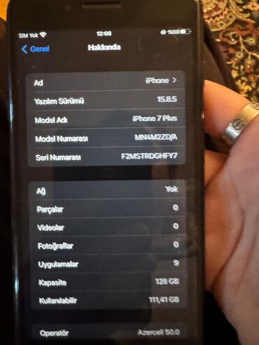 IPhone 7 Plus – 32 GB, Qara - Model nömrəsi: MNQH2LL/A - Serial nömrəsi: FCFT21JH… (şəkildə görünür) - Yaddaş: 32 GB (təxminən 20.38 GB boş) - Ekran: 5.5" Retina HD, Home düyməsi/Touch ID - Arxa k...
