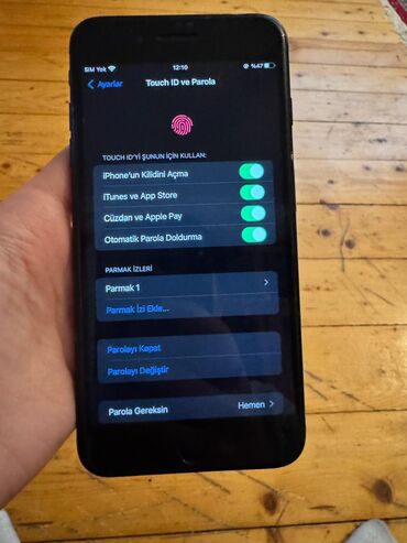 - Touch ID: barmaq izi skaneri aktivdir; kilidin açılması, App Store alışları, Apple Pay və parol avtomatik doldurma üçün işləyir (şəkillərdə göstərilib).