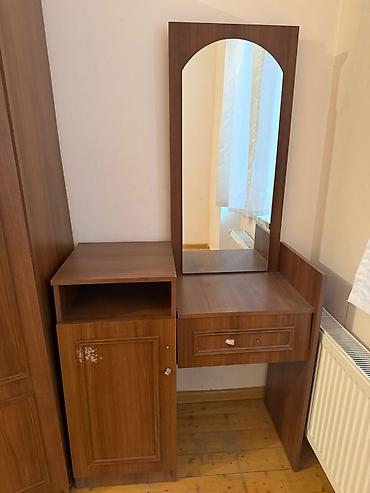 - Tualet masası: eyni rəng və materialda. Geniş işləmə səthi, sağda çekmecə, solda qapılı dolab və açıq rəf bölməsi. Üst hissədə iri, tağ formalı güzgü.