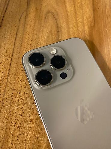 Apple iPhone (Pro seriyası) - Rəng: Gümüş/Narural Titanium (şəkildə) - Korpus: Titan çərçivə, mat arxa panel - Ekran: Super Retina XDR, kənardan kənara, Face ID çentiği - Kamera sistemi: 3 arxa ka...