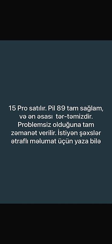 REAL ALICIYA ENDİRİM OLACAQ‼️ Apple iPhone 15 pro 128GB yaddaş 87 pil səliqəli saxlanılıb cızığı əziyi yoxdur. xanım tərəfindən istifadə olunub.1ci əldir. Üstündə qutusu və adaptr ilə verilir. - ...