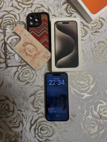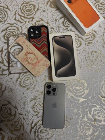 IPhone 15 Pro, Titan göyümtrak-boz rəng (Natural Titanium) – 6.1" Super Retina XDR ekran, Dynamic Island. A17 Pro çipi, 5G dəstəyi. Arxa üçlü kamera sistemi: 48 MP əsas, telefoto və ultra‑geniş; ProRAW/4K video, Night Mode. Face ID, USB‑C portu, MagSafe uyğunluğu.öz telefonumdur 11 ay işletmişem çox səliqəli pil 90% endirim cüzi ola biler kabroları adapteri orjinal özümə yeni telefon aldığım üçün satıram