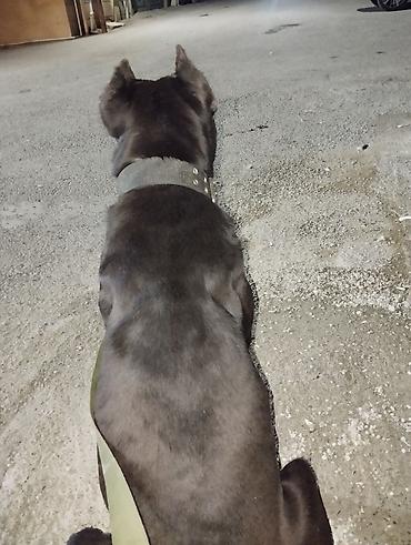 Cane Corso, boz rəng (blue), qulaqları kəsik, boyunluqda mavi yaxalıqla. Güclü, əzələli quruluş, enli döş qəfəsi və möhkəm pəncələr. İtaətkarlıqda əsas komandaları öyrənməyə uyğun, zəncir və yaxalı...