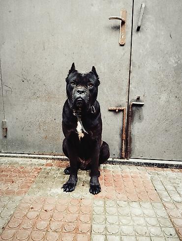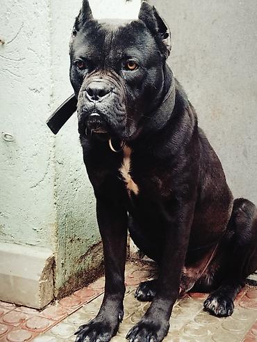 Cane Corso – erkək, qara rəngli, güclü və əzələli quruluşlu it. Xüsusiyyətlər: - Cins: Cane Corso (mastif tipli, iri ölçülü) - Cinsiyyət: Erkək - Rəng: Tünd qara/şokolad tonları, sinədə ağ ləkə - ...