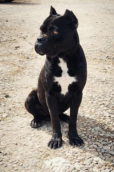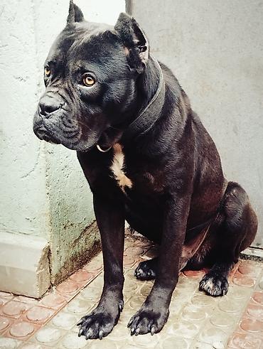 Cane Corso tipli iri ölçülü it - Rəng: qara, sinədə ağ ləkələr - Boyunbağı ilə - Güclü skelet quruluşu, enli sinə və əzələli bədən - Kəsik qulaqlar - Sakit və diqqətli xarakter, həyət və mülk müha...