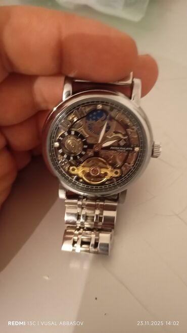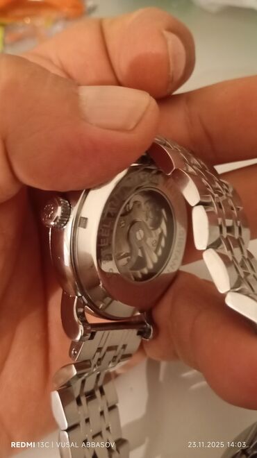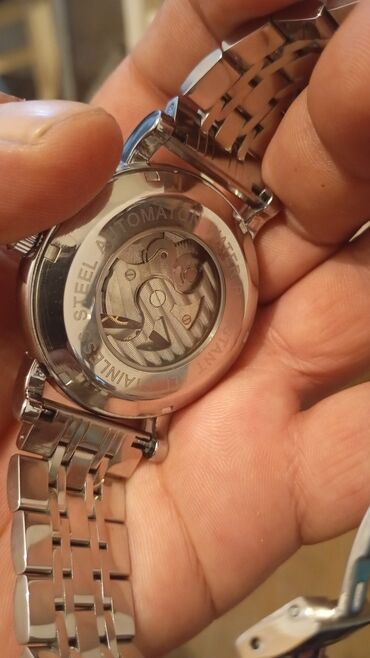 - Mexanizm: arxası şəffaf qapaqlı avtomatik (self‑winding) mexanizm; rotor və dişlilər görünür.