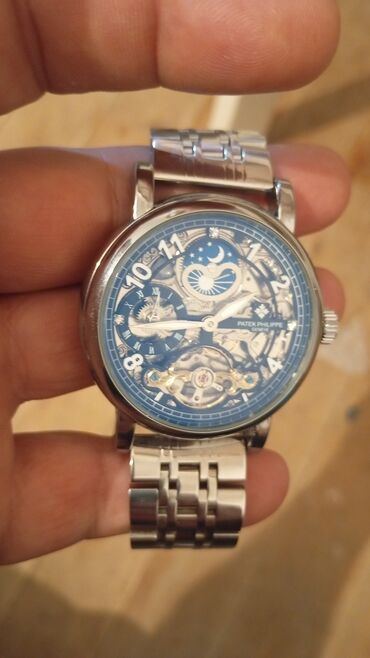 - Siferblat: skelet dizaynlı, mavi/qəhvə tonlarında detallı dekor; böyük rəqəm indeksləri və oxvari əqrəblər.