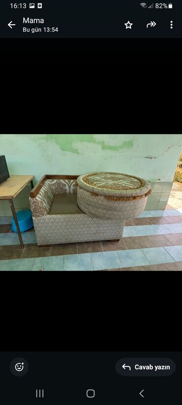 - Yumru puf/oturacaq: Divanla eyni parçadan hazırlanıb, üst hissəsi bəzəkli kənar bordürlə tamamlanıb. Ayaqaltı və ya əlavə oturacaq kimi istifadə edilə bilər.