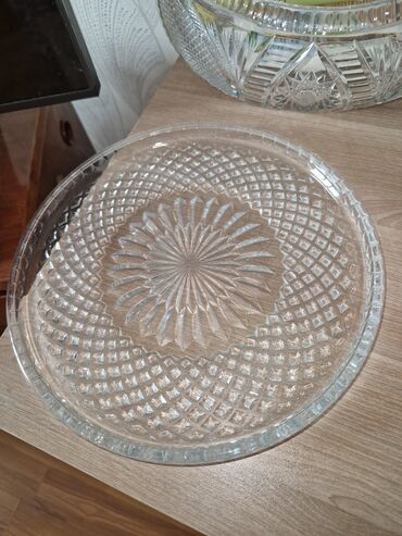 Kəsimli şüşədən (kristal üslubda) dekorativ qablar dəsti - 1 ədəd ayaqlı, enli meyvə/qənnadı qabı: dairəvi formalı, dərin olmayan kasa, kvadrat əsaslı ayaq, üzəri ulduz və dairə motivli zəngin kəs...