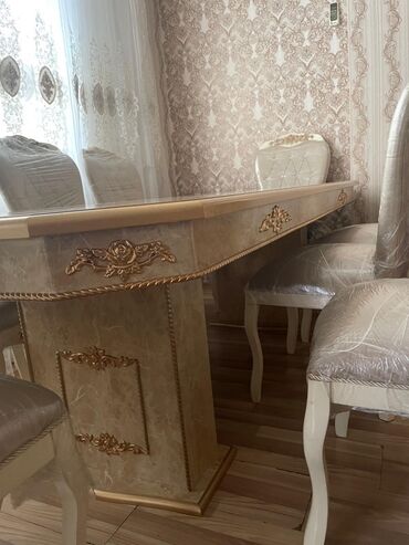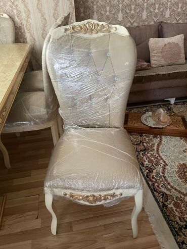 - Stullar: krem rəngli yumşaq oturacaq və bel hissə, kapitone düyməli dizayn; ağ/classic əyri ayaqlar; üst və ön hissədə qızılı oyma gül ornamentləri